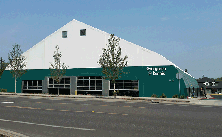 Evergreen Tennis is now in its fourth year of operations and employs 11 people, including three full-time tennis pros. The club consists of four courts with a tensile fabric translucent ceiling that allows natural light in, similar to the Wimbledon’s center court. There are giant cargo doors that overlook a natural wetland that are opened during the summer months. This open design allows for the look and feel of playing tennis outdoors.